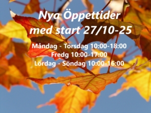 - Nya öppettider för receptionenMed start måndag 27/10 har vi nya öppettider: Måndag-Torsdag 10-18 Fredag 10-17 Lördag-Söndag 10-16.
